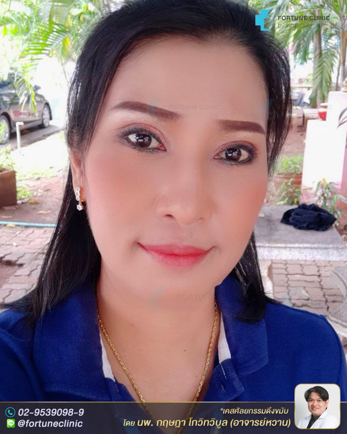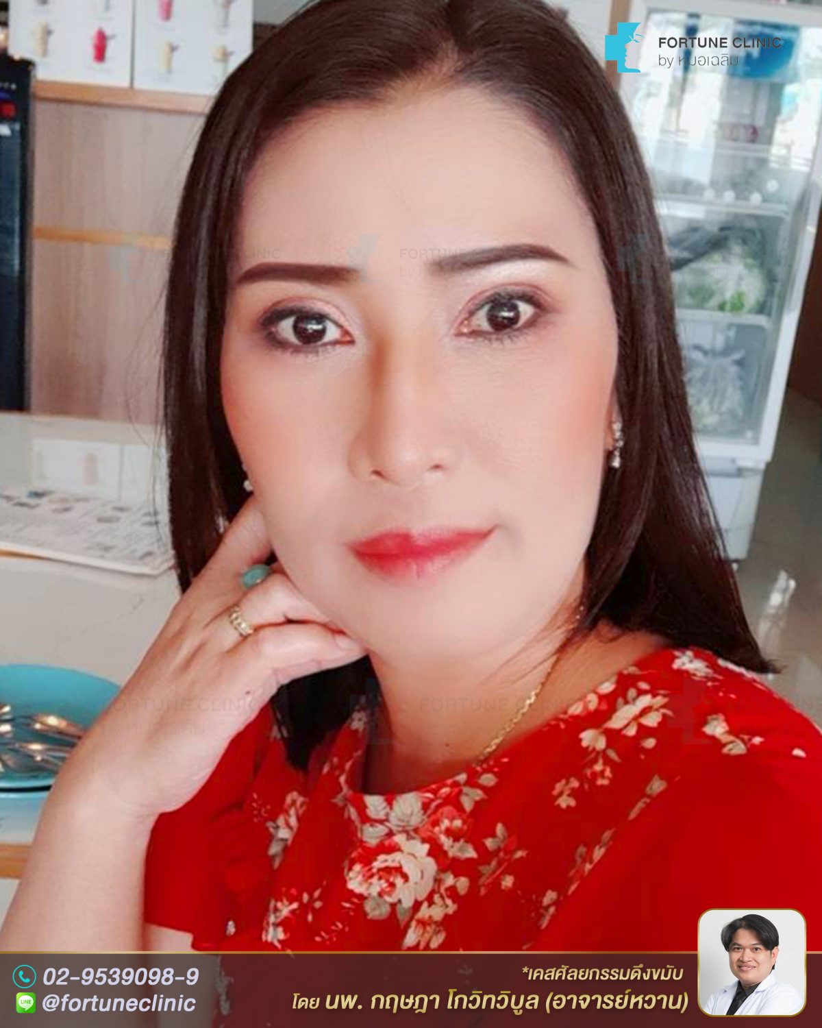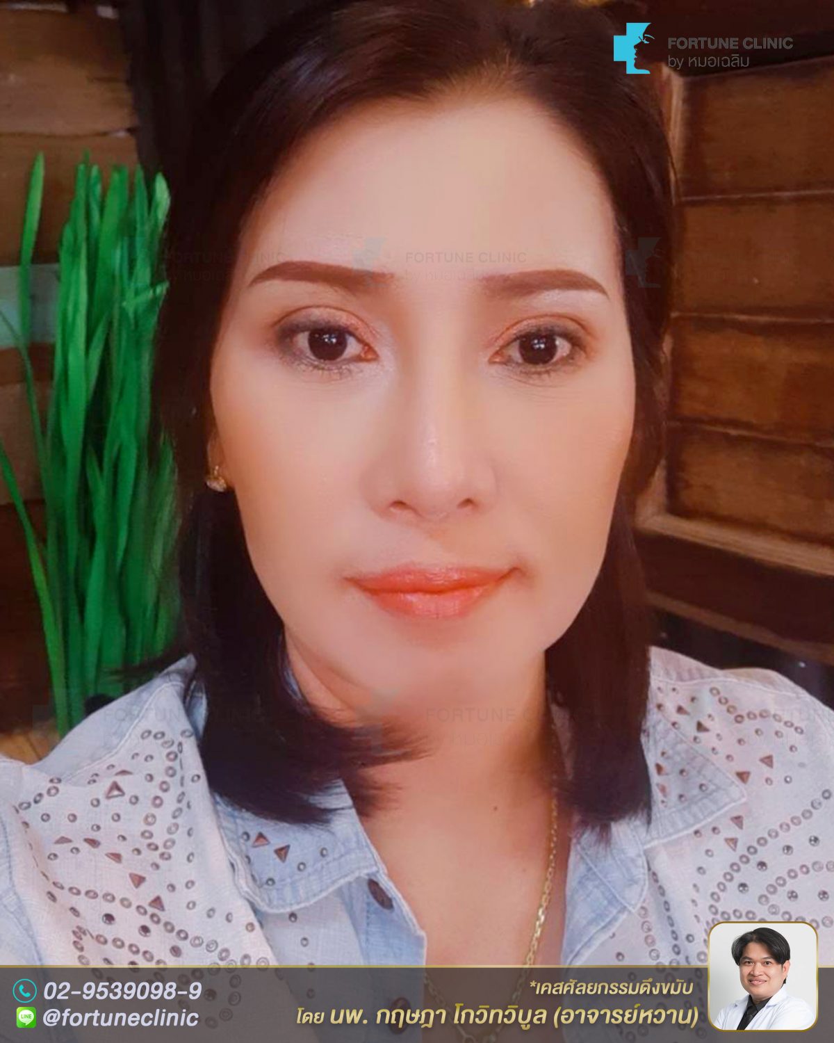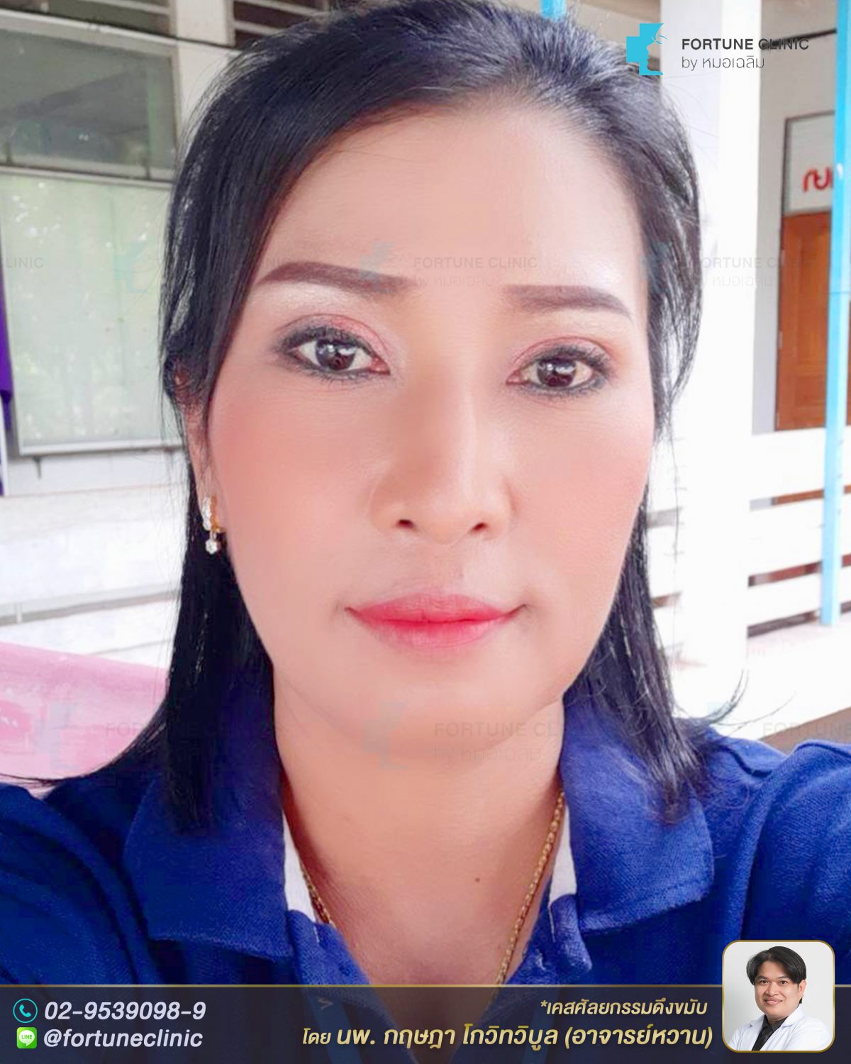 ก่อนหน้านี้มีปัญหาเรื่องผิวใบหน้าหย่อนคล้อยส่วนบน หางตาตก หางคิ้วตก ตาดูเศร้า ทำให้ดูมีอายุ ดูโทรม ปต่ใบหน้าส่วนกลางและล่างไม่ได้หน่อยคล้อยมาก