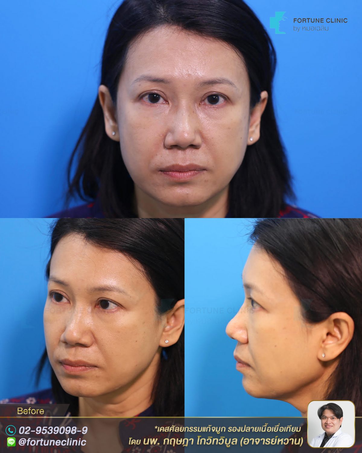 เดิมเคยเสริมจมูกมาก่อน แต่รูปหน้ายังดูไม่มีมิติ ดูเป็นแท่ง สันไม่เรียบ ปลายจมูกยังดูใหญ่ไม่เรียวสวย ปีกกว้าง คนไข้ต้องการให้มีสันจมูกหัวตาสูงขึ้น ให้จมูกเรียวสวย และมีปลายจมูกที่เรียวเล็กลง