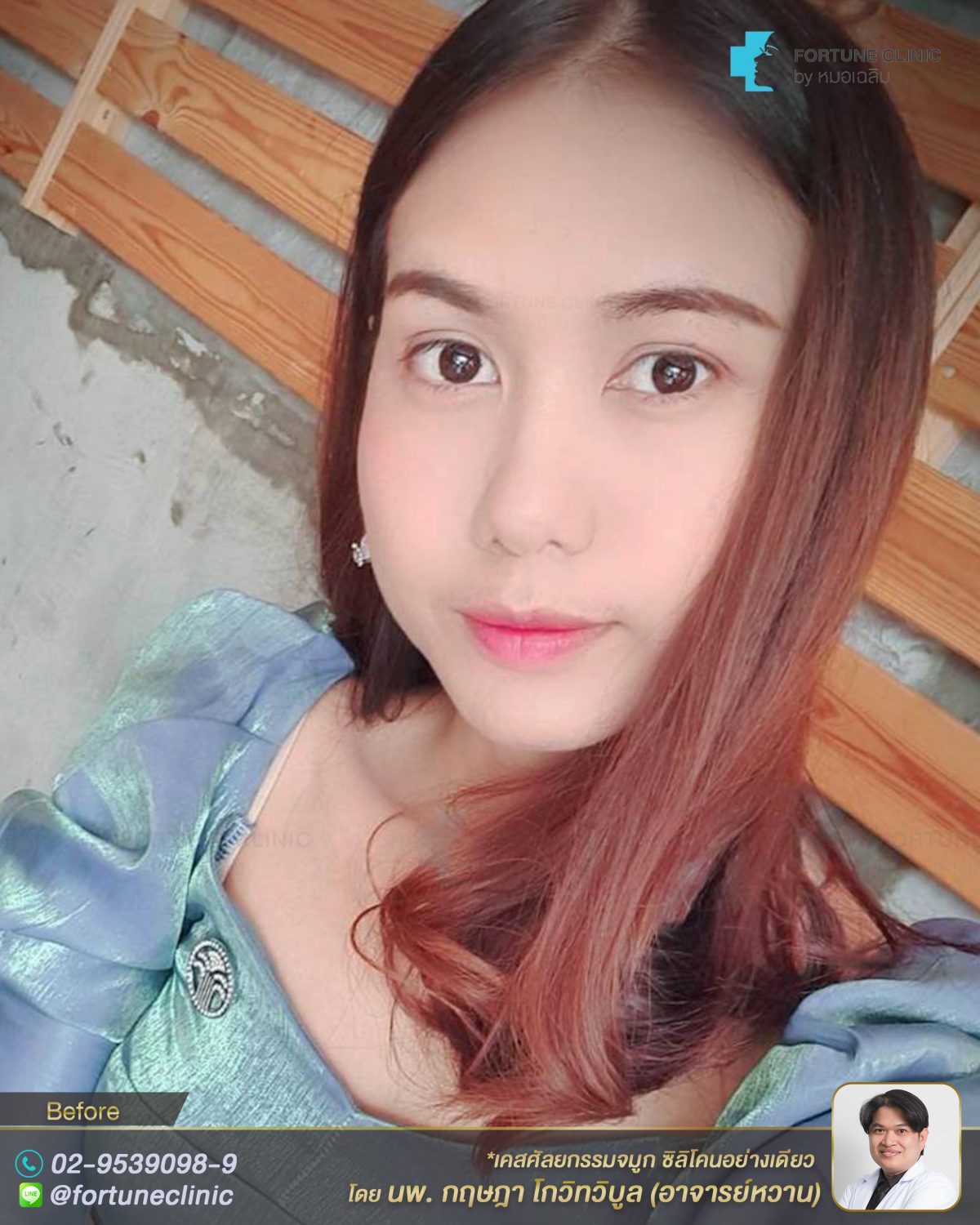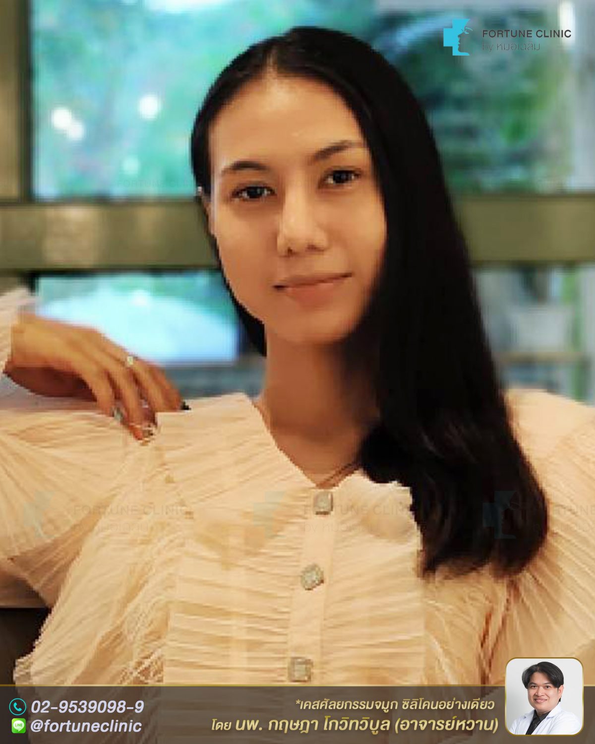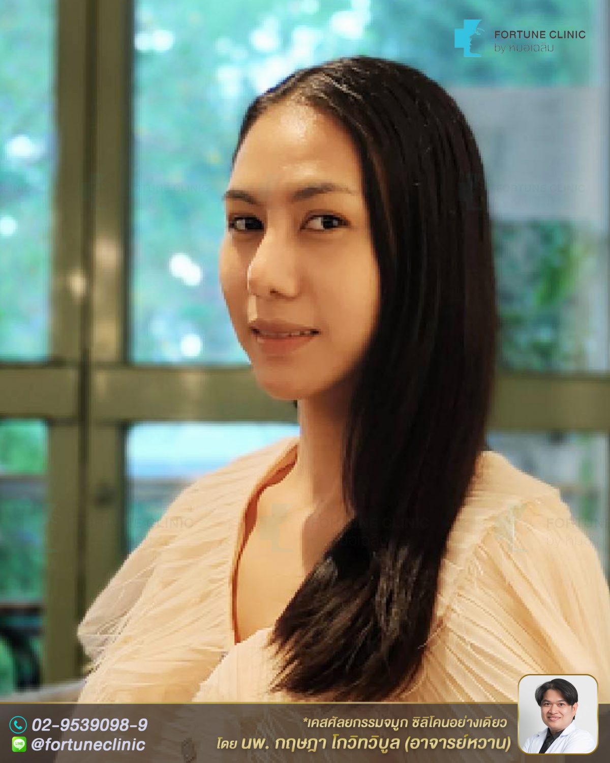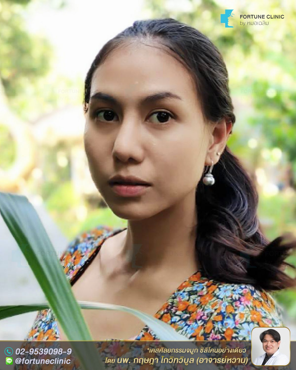 เดิมสันจมูกไม่โด่งมาก เนื้อน้อย ปลายจมูกพอมี หมอหวานจึงแนะนำเสริมบางๆ เน้นทรงจมูกให้ชัดขึ้น มีมิติมากขึ้น