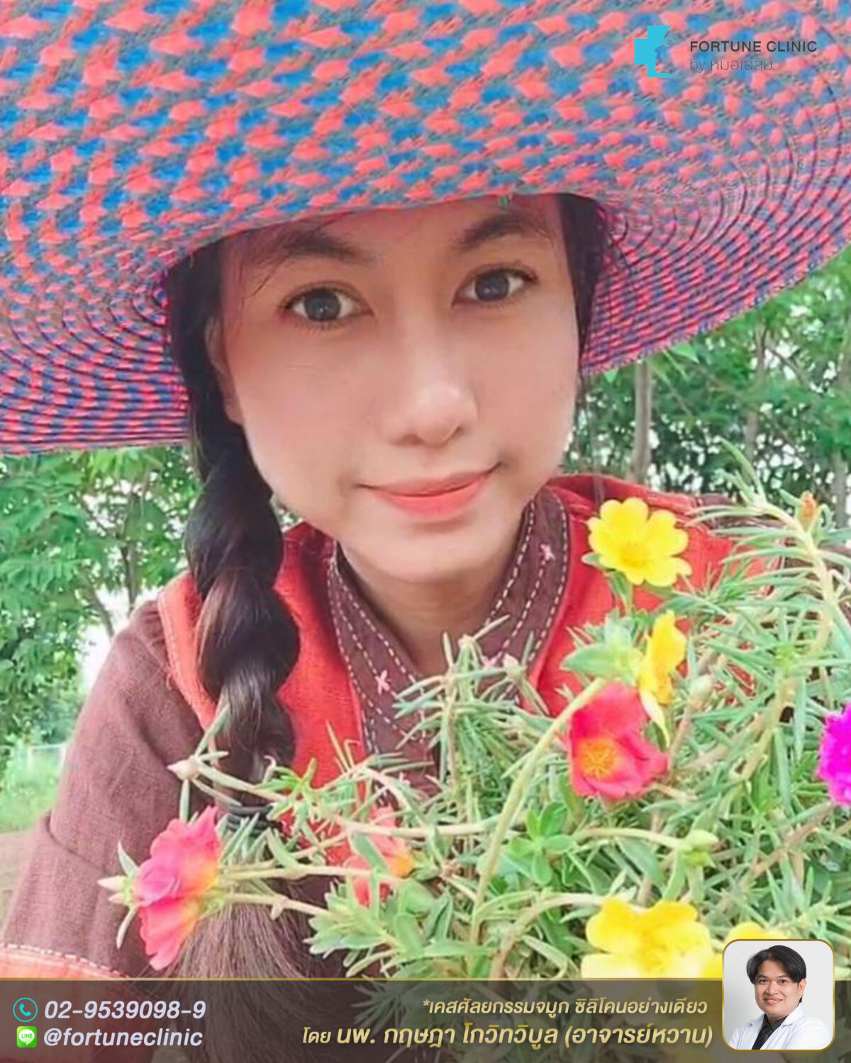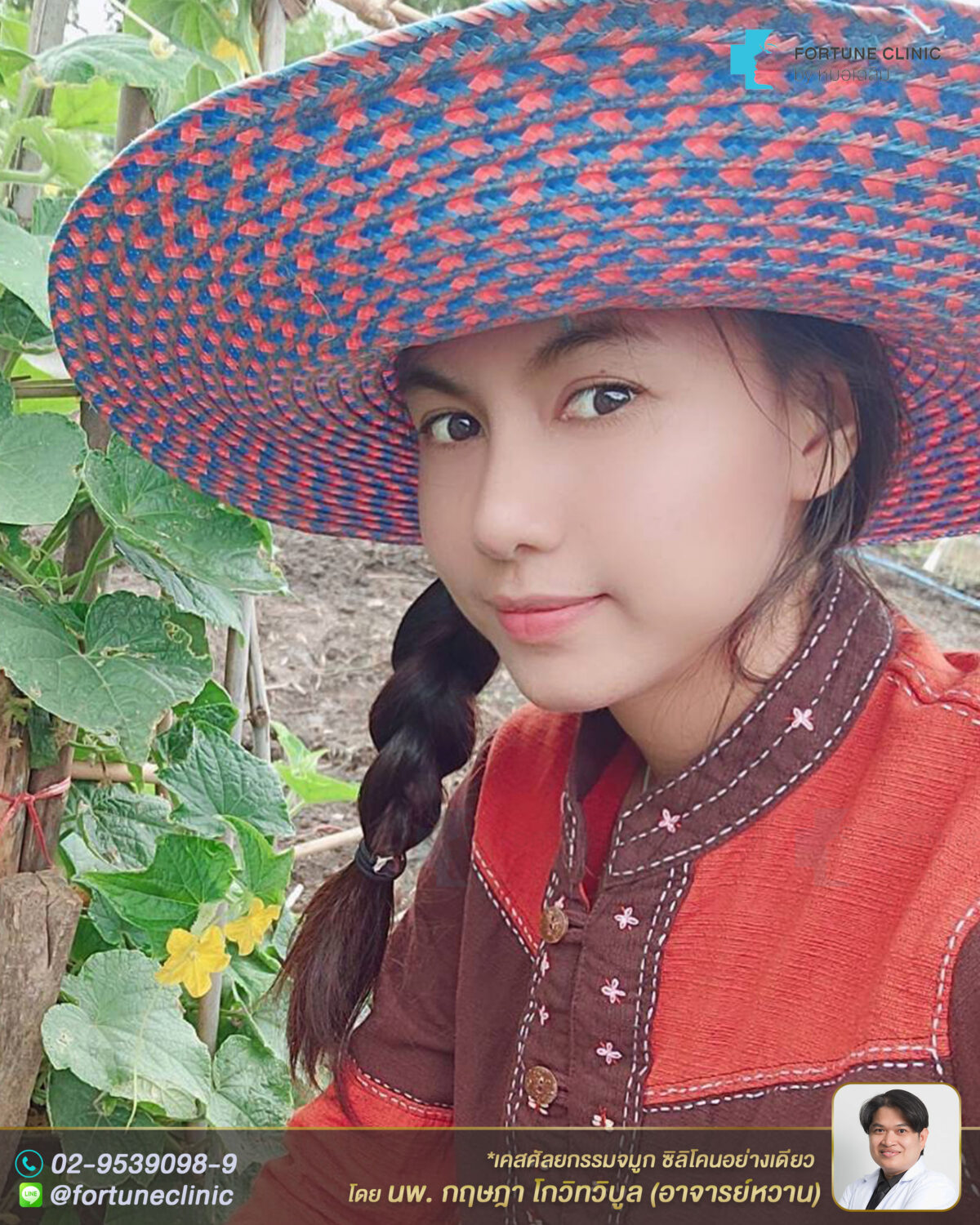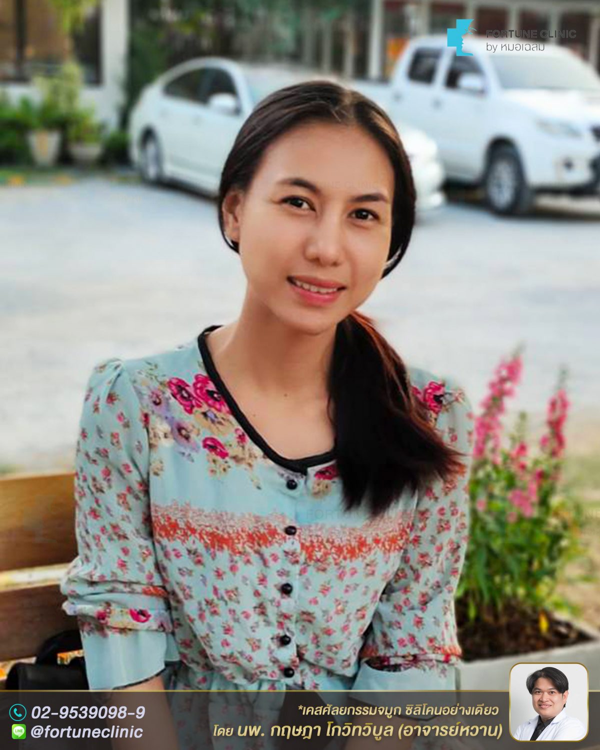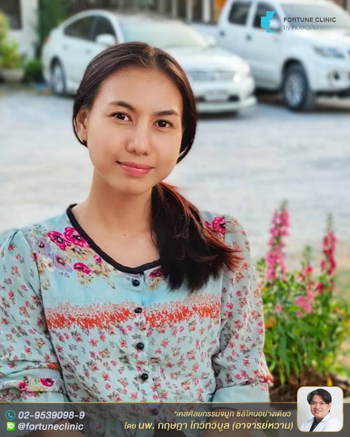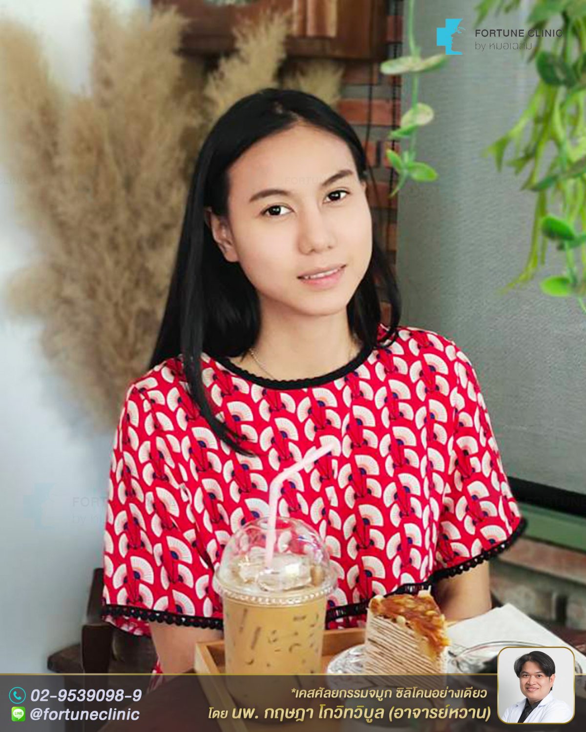 เดิมสันจมูกไม่โด่งมาก เนื้อน้อย ปลายจมูกพอมี หมอหวานจึงแนะนำเสริมบางๆ เน้นทรงจมูกให้ชัดขึ้น มีมิติมากขึ้น