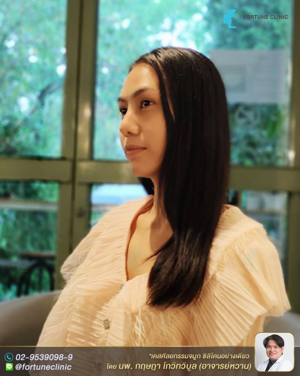 หลังเสริมคนไข้หน้าสวยมีมิติขึ้น สันจมูกโด่งสวย เนียนเป็นธรรมชาติ จมูกสวยเป็นทรงสโลป หัวตาเนียนสวยไร้ร่องรอยต่อ ปลายจมูกพุ่งสวยเรียวเล็กลง ปีกจมูกเรียวสวยขึ้น รูปหน้ามีมิติและดูเรียวเล็กลงมากค่า